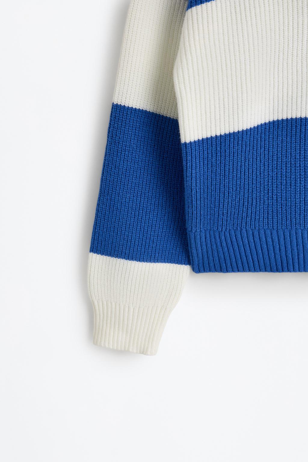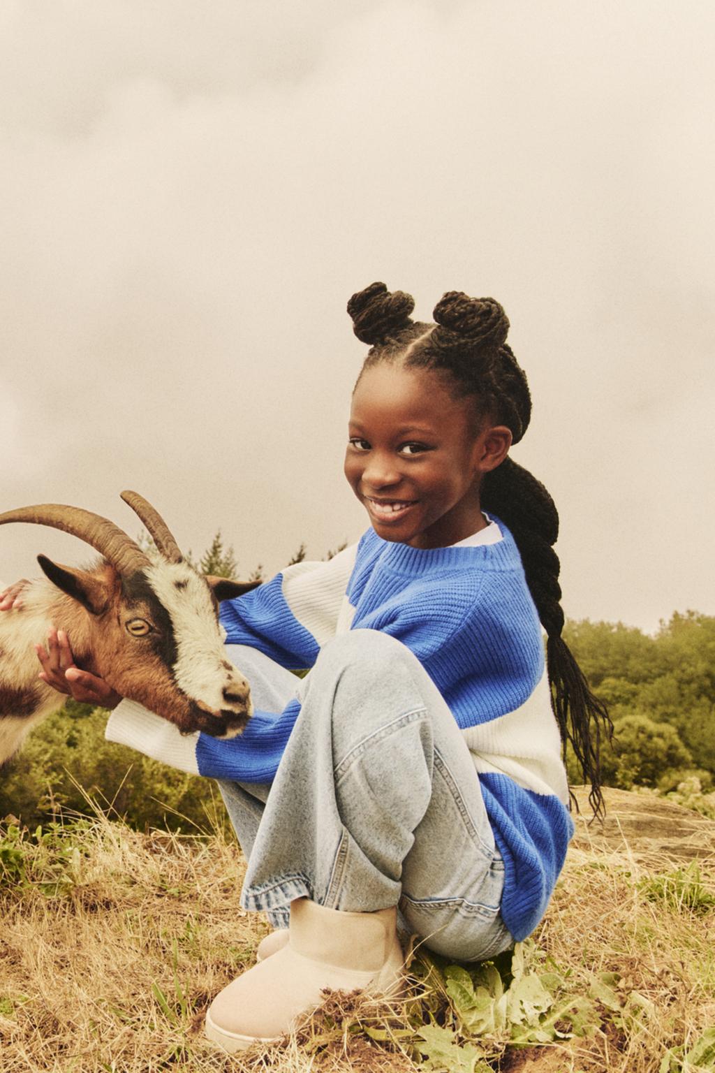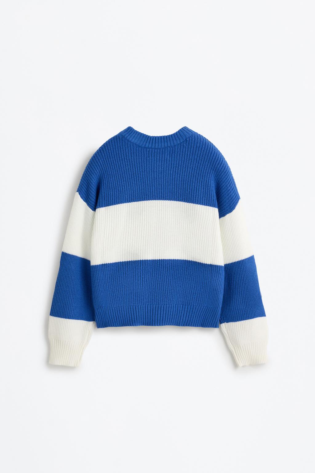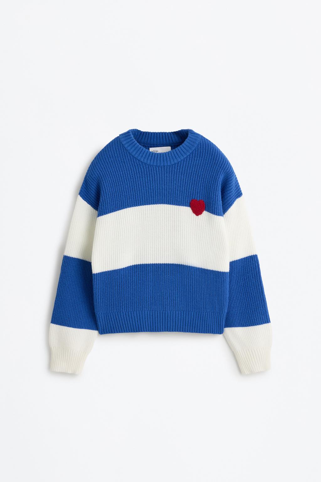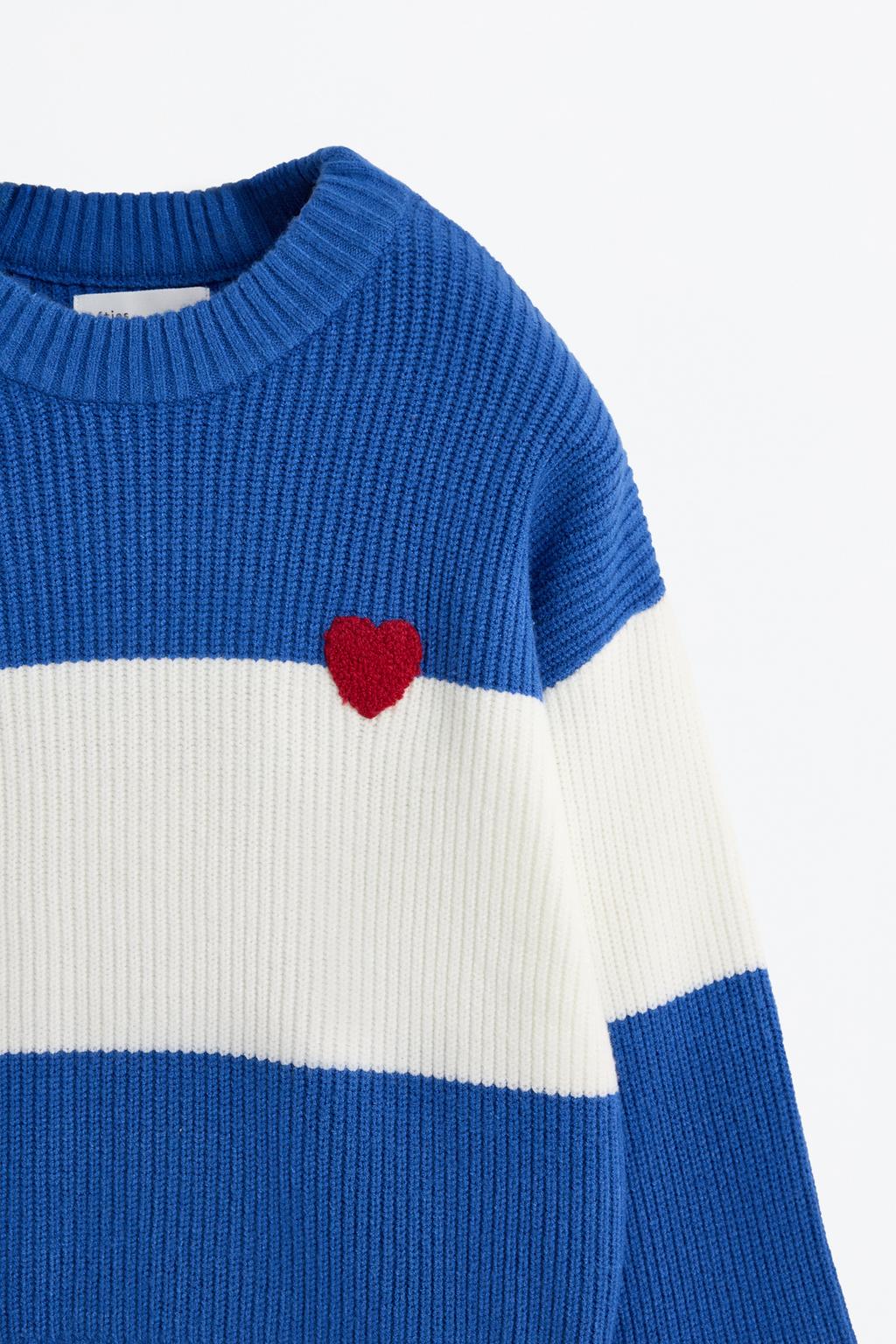 This delightful crew neck sweater features charming puff long sleeves and playful towel fabric embroidery at the chest level. Crafted from thick striped ribbed knit material, it combines comfort and style, making it the perfect addition to your child’s wardrobe for cozy days and fun outings.
