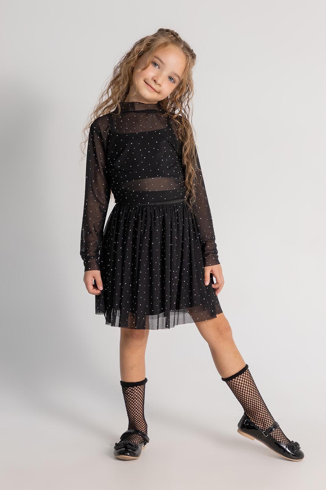 Girls' Black Tulle Polka Dot Long Sleeve Dress Set - Elegant Party & Special Occasion Design