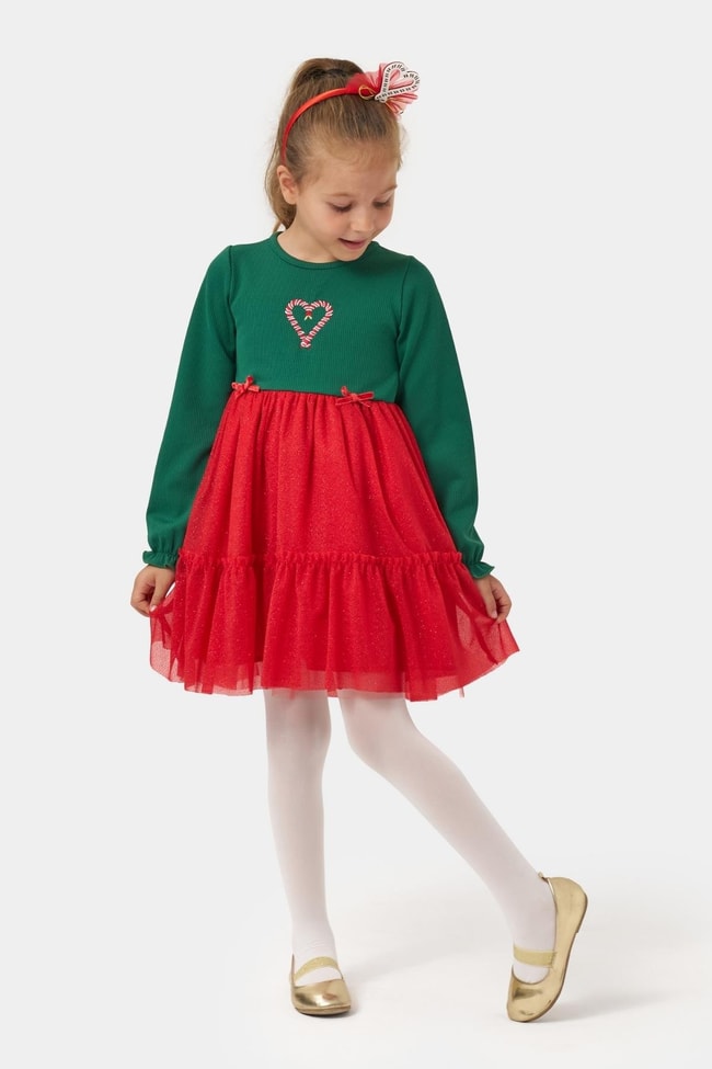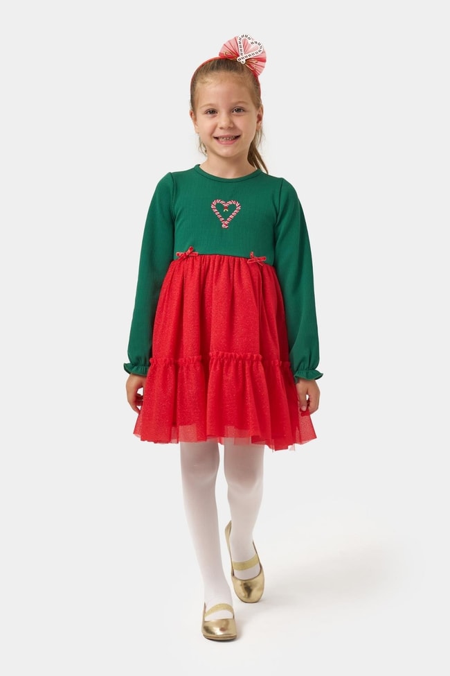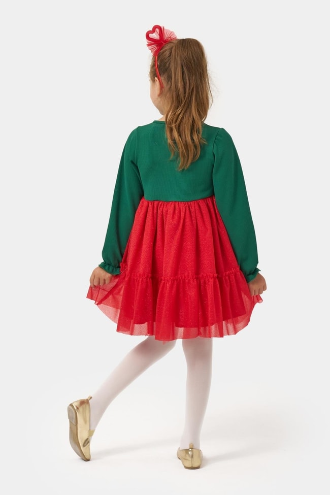 Girls’ Cotton Green Heart Long Sleeve Red Tulle Dress – Holiday Theme