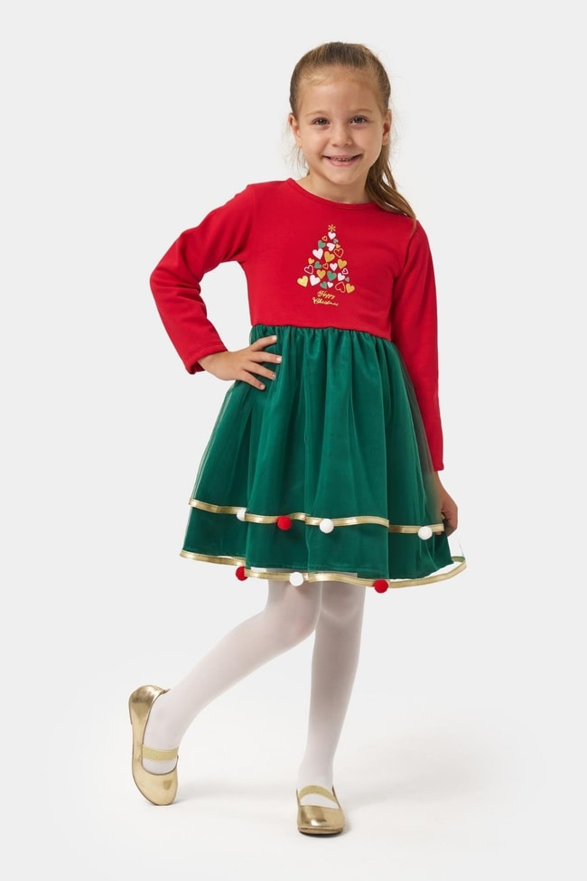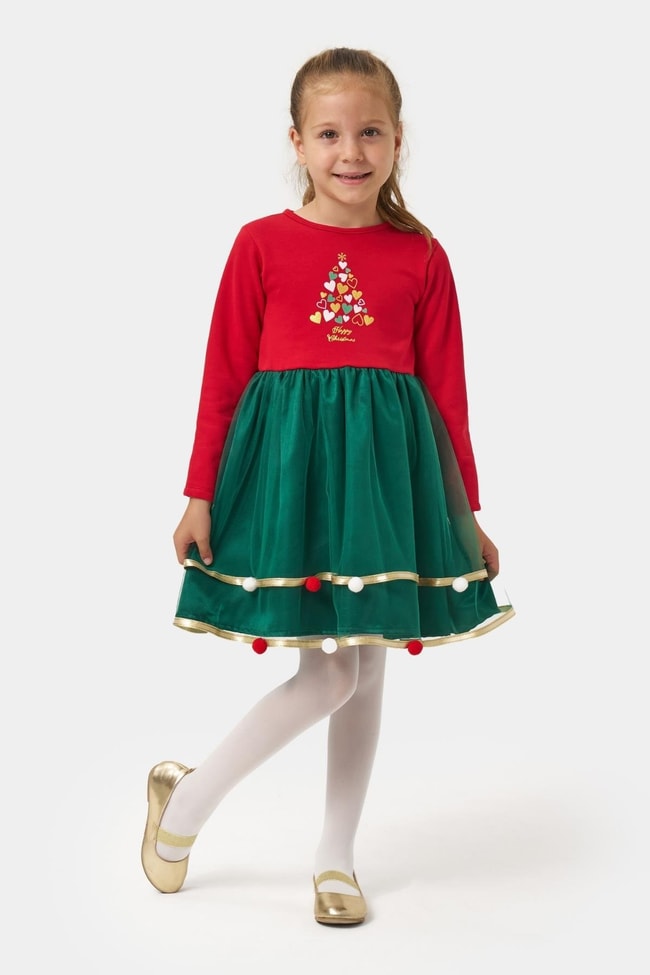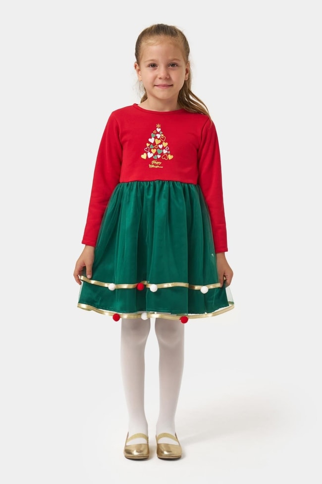 Girls’ Cotton Red Christmas Tree Pattern Dress with Tulle and Pom Pom Details