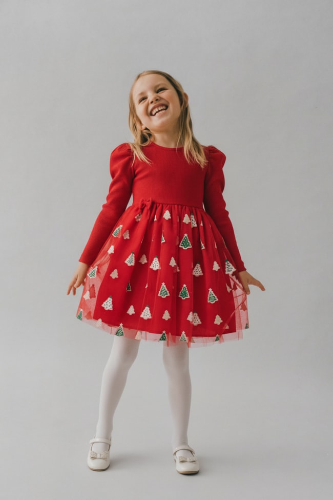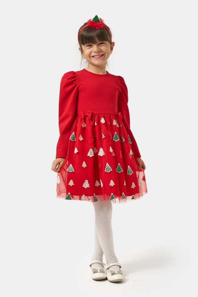 Celebrate the festive season in style with this enchanting red dress for girls, designed to capture the joyous spirit of Christmas. Crafted from soft, breathable cotton, it ensures comfort and flexibility for all-day wear. The charming balloon sleeves add a touch of elegance, while the playful tulle overlay adorned with delightful Christmas tree patterns brings a fun sparkle, making it the perfect choice for holiday gatherings and celebrations.