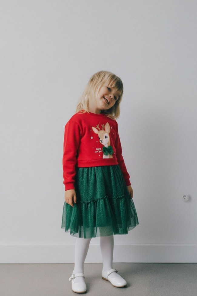 Designed for the most joyful times of the year, this vibrant red sweatshirt and enchanting green tulle skirt set reflects the energy of little ones. Crafted from soft cotton fabric, it offers a gentle comfort against the skin while ensuring all-day ease with its soft texture. The playful deer print on the sweatshirt adds fun details, while the sparkling tulle skirt brings an elegant touch to festive celebrations.