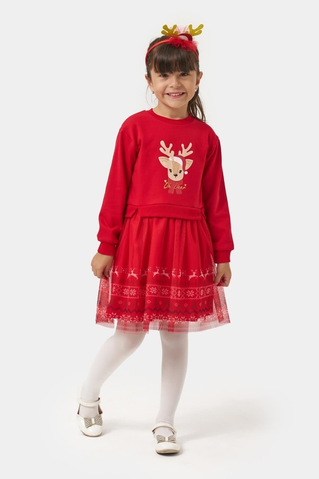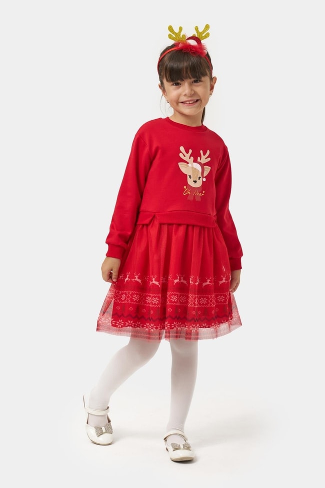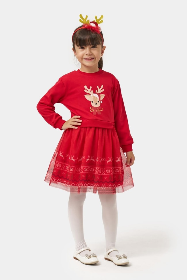 Designed for the festive season, this enchanting red dress for girls features an adorable deer print and elegant tulle details that capture attention. Crafted from soft, breathable cotton, the dress ensures all-day comfort while the tulle skirt adorned with snowflakes and deer patterns adds a magical touch, making it perfect for holiday celebrations.
