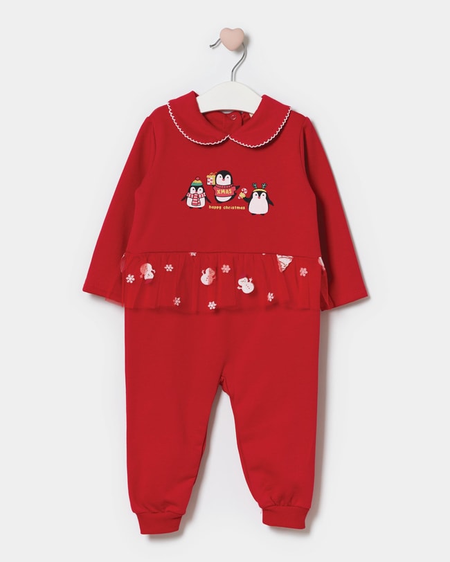 This charming red cotton romper, designed especially for baby girls, adds a joyful touch to the holiday season! With its soft, gentle cotton fabric, it snugly wraps around your baby’s delicate skin, while the adorable penguin prints and ‘Happy Christmas’ detail create an irresistibly cute look. The white stitched Peter Pan collar adds an elegant finish, and the tulle ruffle at the waist, featuring tiny snowman and snowflake patterns, is sure to catch everyone’s eye. The snap closure at the back ensures easy dressing, and the ribbed cuffs enhance comfort. Perfect for holiday parties, photo shoots, or cozy celebrations at home, this romper is a delightful choice for your little one’s festive wardrobe.