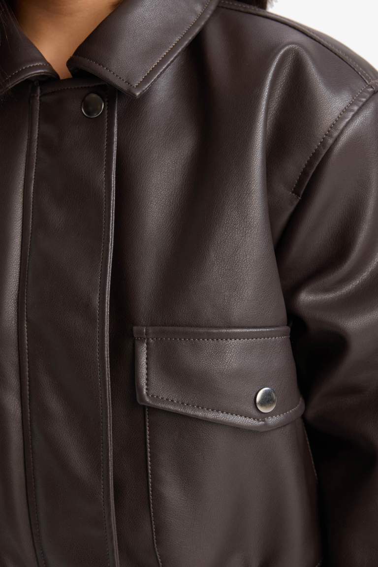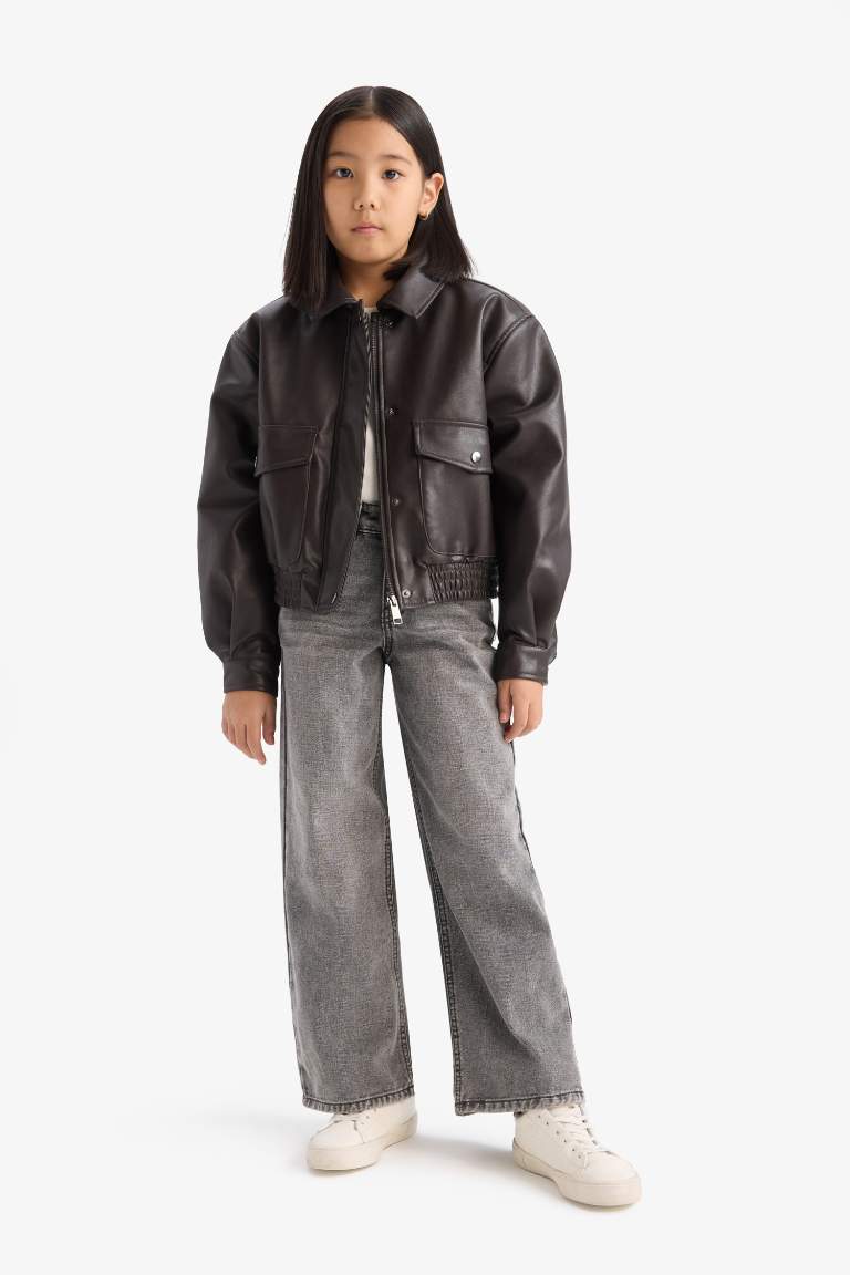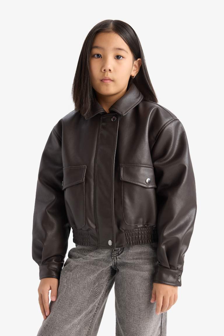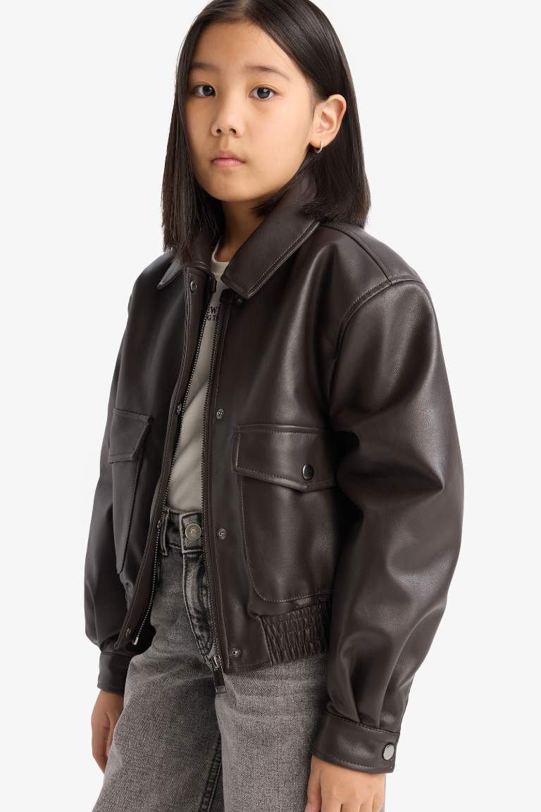 Girls' Waterproof Zippered Faux Leather Jacket with Double Pockets