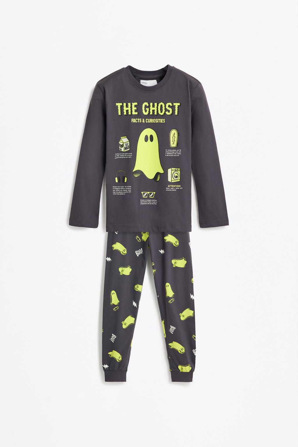 Snuggle up in our adorable Glow-in-the-Dark Ghost Pajama Set, featuring playful ghost prints that light up in the dark! This two-piece outfit includes a long-sleeve, crew neck top and matching long pants with a comfortable elastic waistband. Made from 100% soft cotton, it’s perfect for cozy nights and sweet dreams. Your little ones will love the fun design and the exciting glow, making bedtime a delightful adventure!