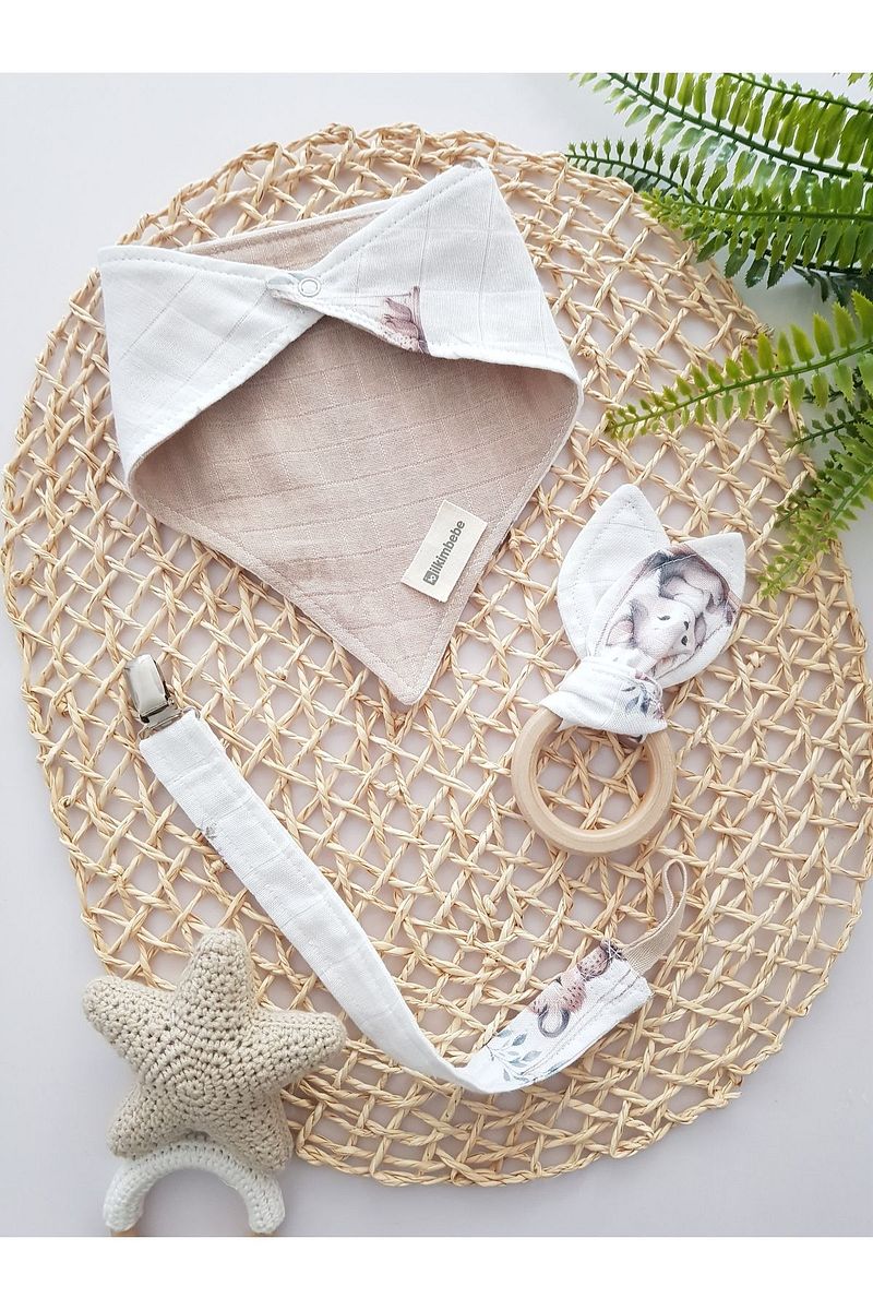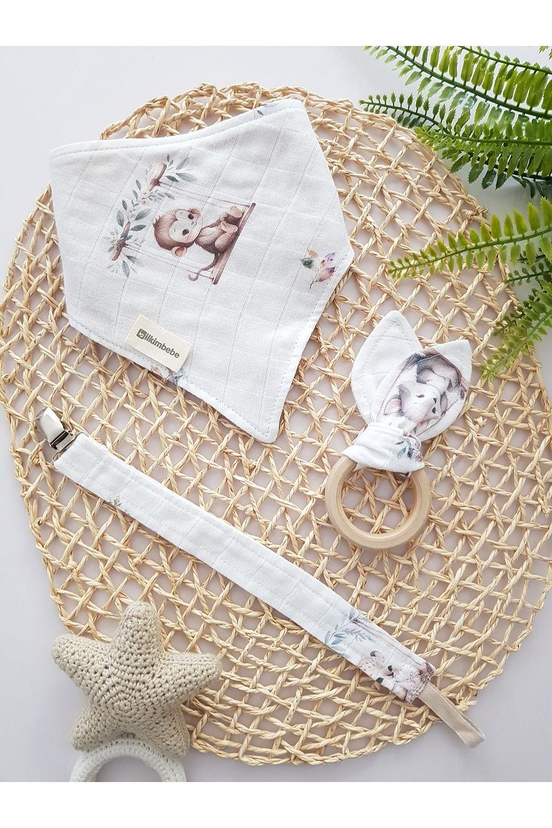 ilkimbebe Baby Bib, Pacifier Chain and Wooden Teether Set