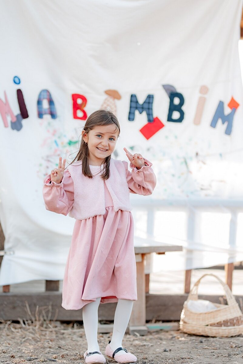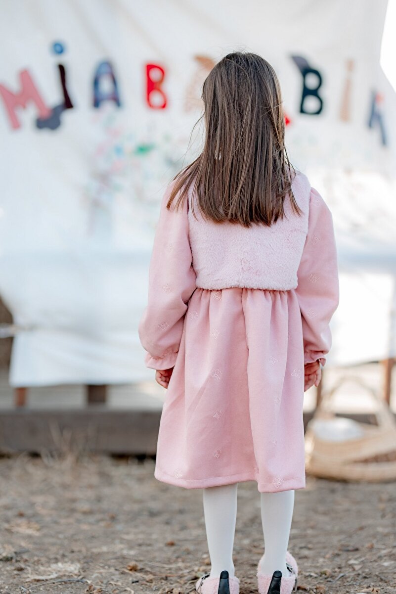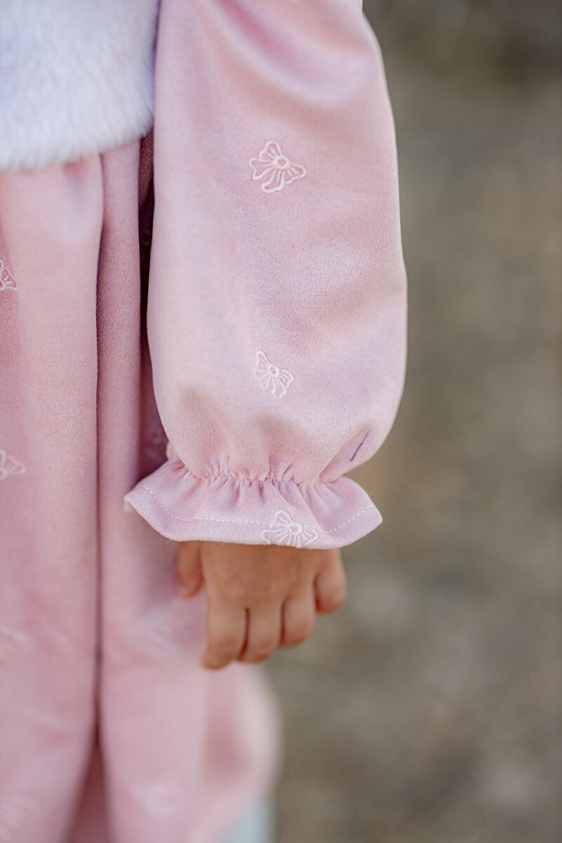miabambim Faux Fur Suede Bow Embroidered Dress Pink