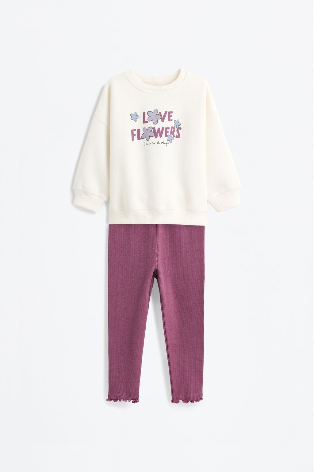 This delightful two-piece set features a classic combination of a stylish sweatshirt and comfortable leggings, perfect for your little one. The sweatshirt boasts a crew neckline with ribbed elastic detailing on the collar, sleeves, and hem, complemented by a fun printed design and a soft brushed interior for ultimate coziness. The matching leggings are designed with a wavy hem and an elastic waistband that ensures a snug yet flexible fit. Made from stretchy cotton, this outfit is ideal for playtime or casual outings, providing both style and comfort for your child’s adventures.