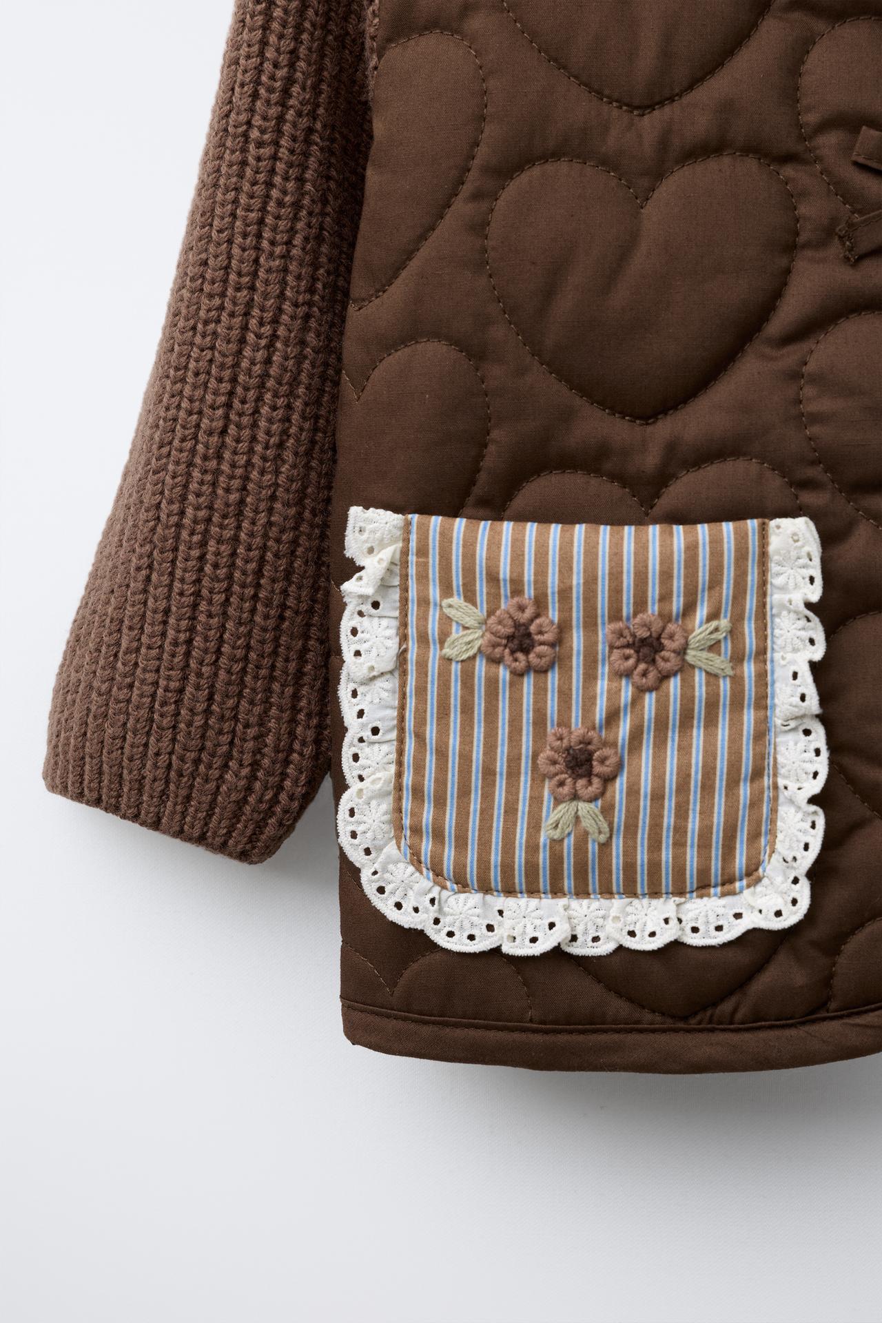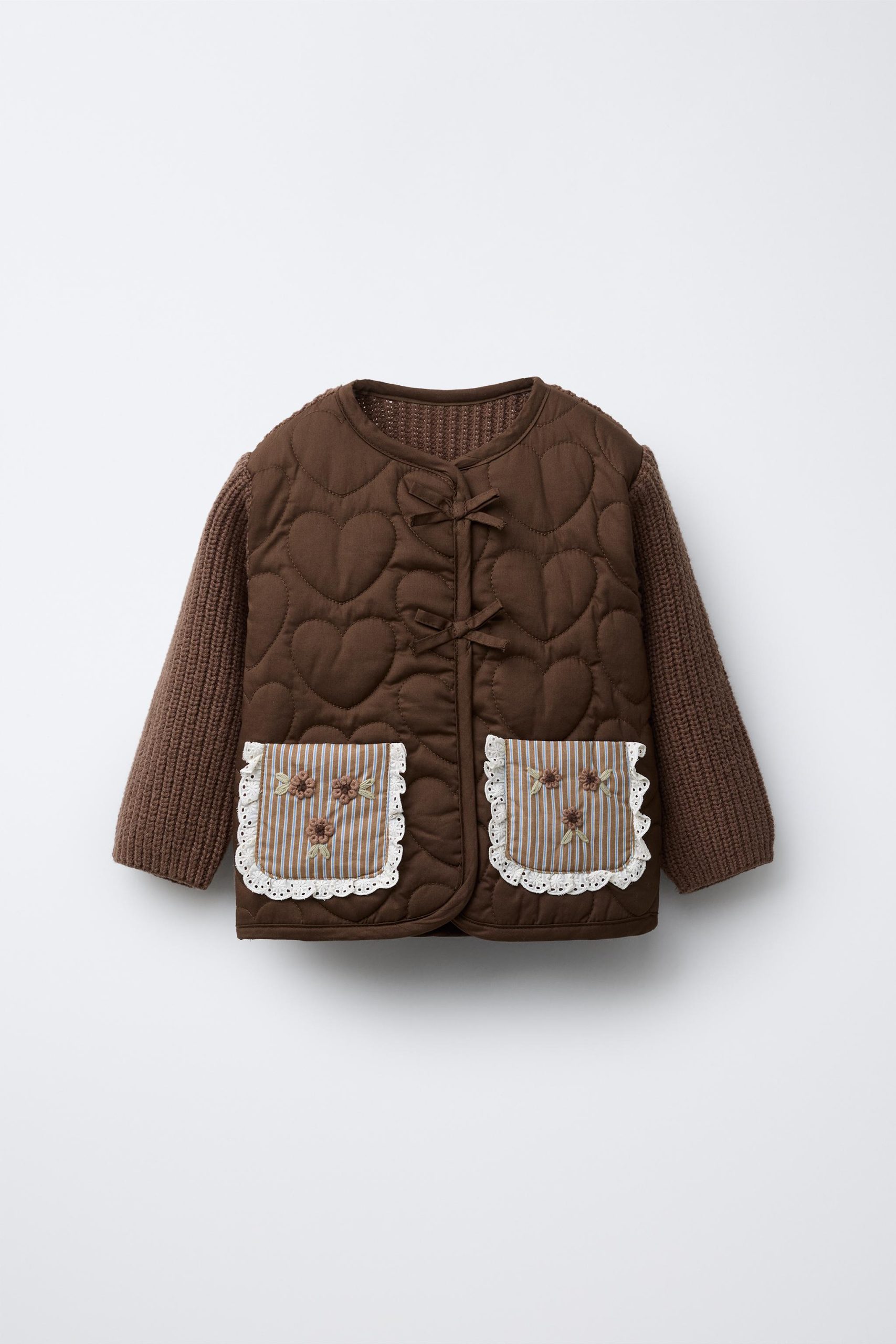 This charming quilted jacket is perfect for keeping your little one warm and stylish. With a round neck and cozy long knit sleeves, it features a hidden snap-button fastening adorned with a cute bow appliqué on the front. The front patch pockets are enhanced with a lovely lace appliqué, while a delightful striped print and embroidered flower details add a playful touch. Ideal for layering, this jacket is a must-have for every child’s wardrobe.