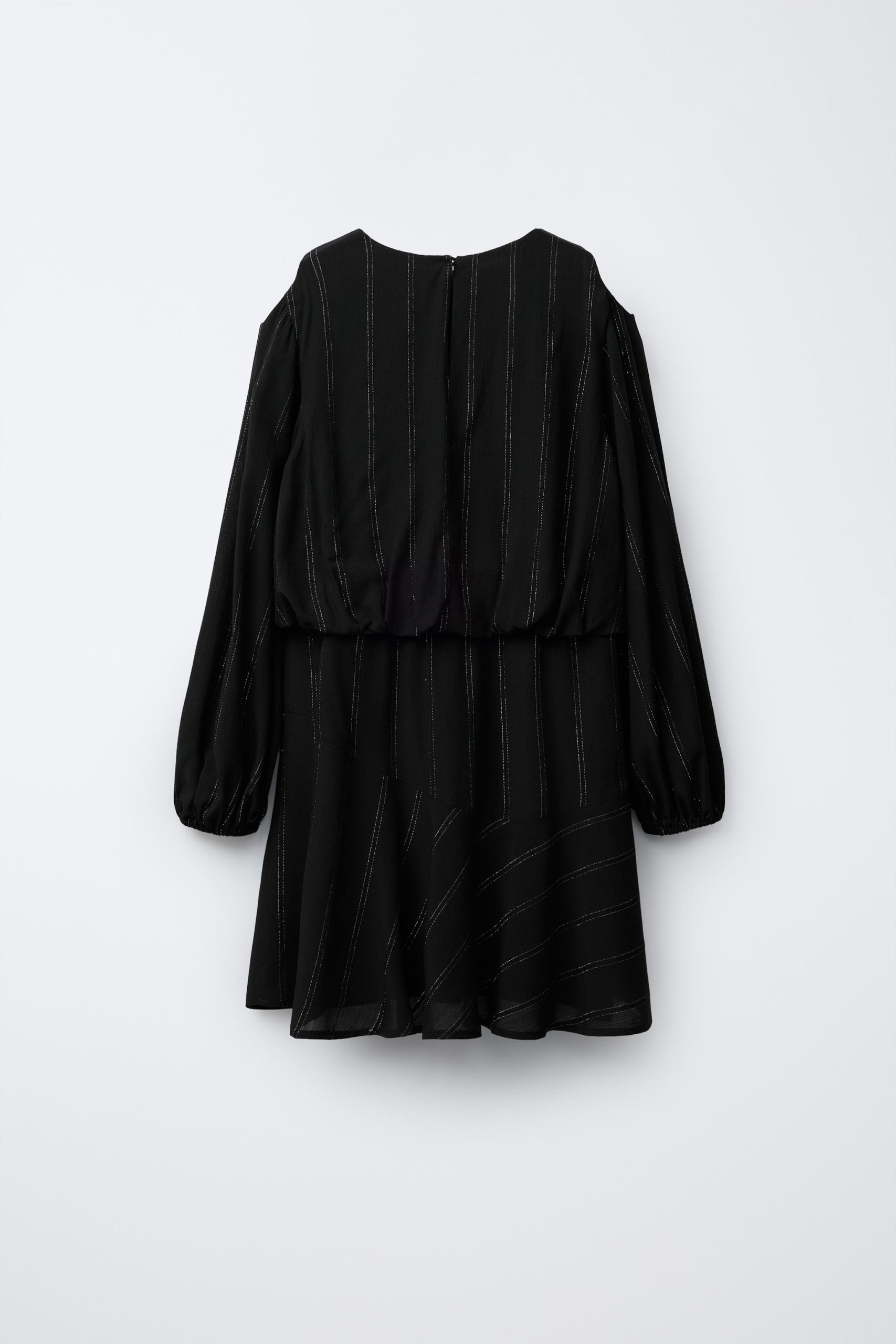 This enchanting sparkly striped dress is perfect for your little fashionista! With a charming round neck and long sleeves featuring elasticated cuffs, it offers both style and comfort. The design showcases bare shoulders and a delightful teardrop opening with a button at the back for easy wear. The waist is elegantly cinched with elasticated detail, and the dress is fully lined for added comfort. Ideal for special occasions or everyday fun, this dress will make your child shine brightly!