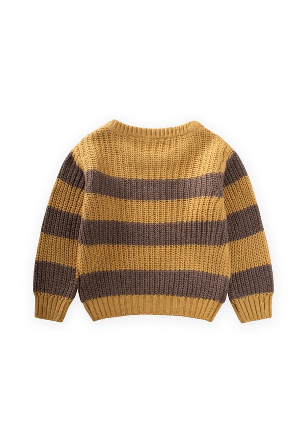 Keep your little ones cozy and stylish during chilly winter days with our Striped Knit Sweater. Made from a blend of 50% recycled cotton and 50% polyester, this sweater offers a soft and breathable texture that is gentle on young skin. Its vibrant mustard yellow color adds a fun pop to any outfit, making it perfect for playdates or family outings. Easy to care for, simply machine wash at a maximum of 30ºC to maintain its quality and comfort.
