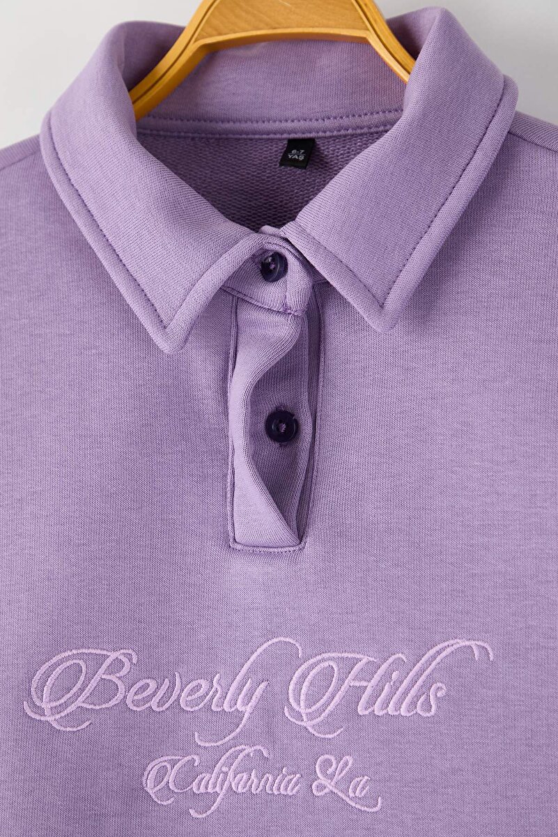 Trendyolmilla Kids Lilac Cotton Slogan Printed Polo Neck Oversized Knit Sweatshirt
