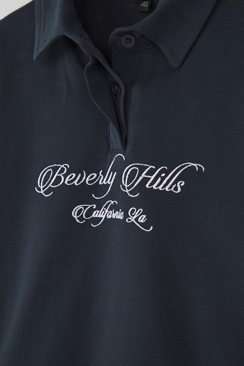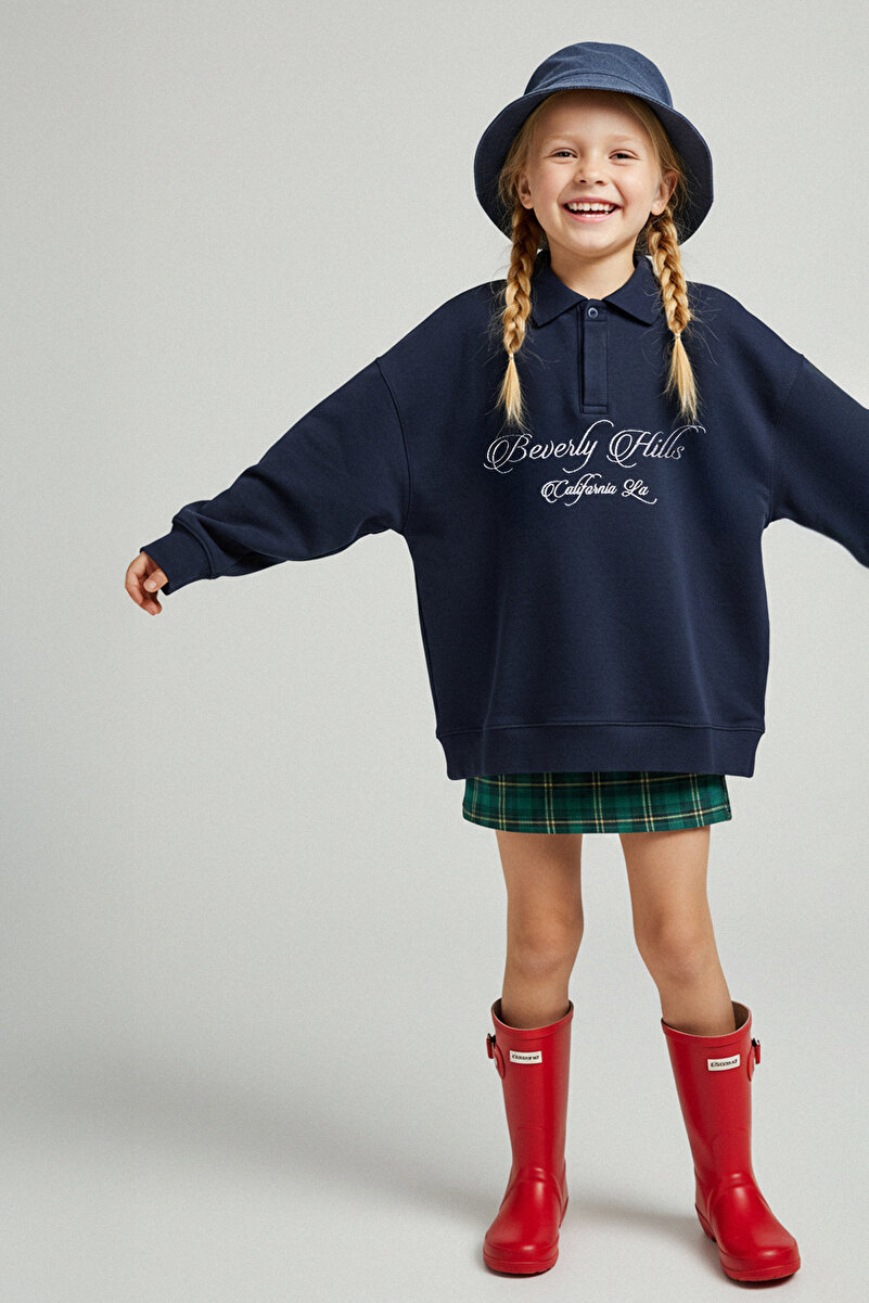 Trendyolmilla Kids Navy Blue 100% Cotton Slogan Printed Polo Neck Oversized Knit Sweatshirt