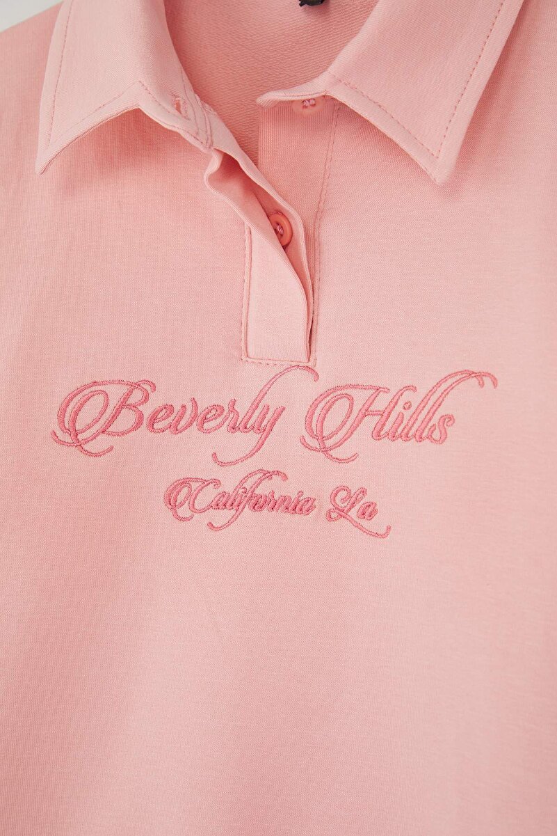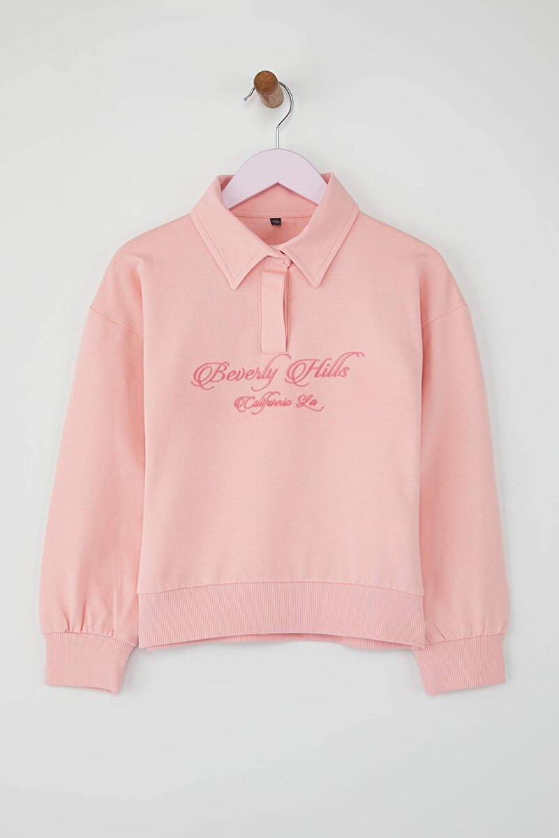 Trendyolmilla Kids Pink 100% Cotton Slogan Printed Polo Collar Oversized Knit Girls' Sweatshirt