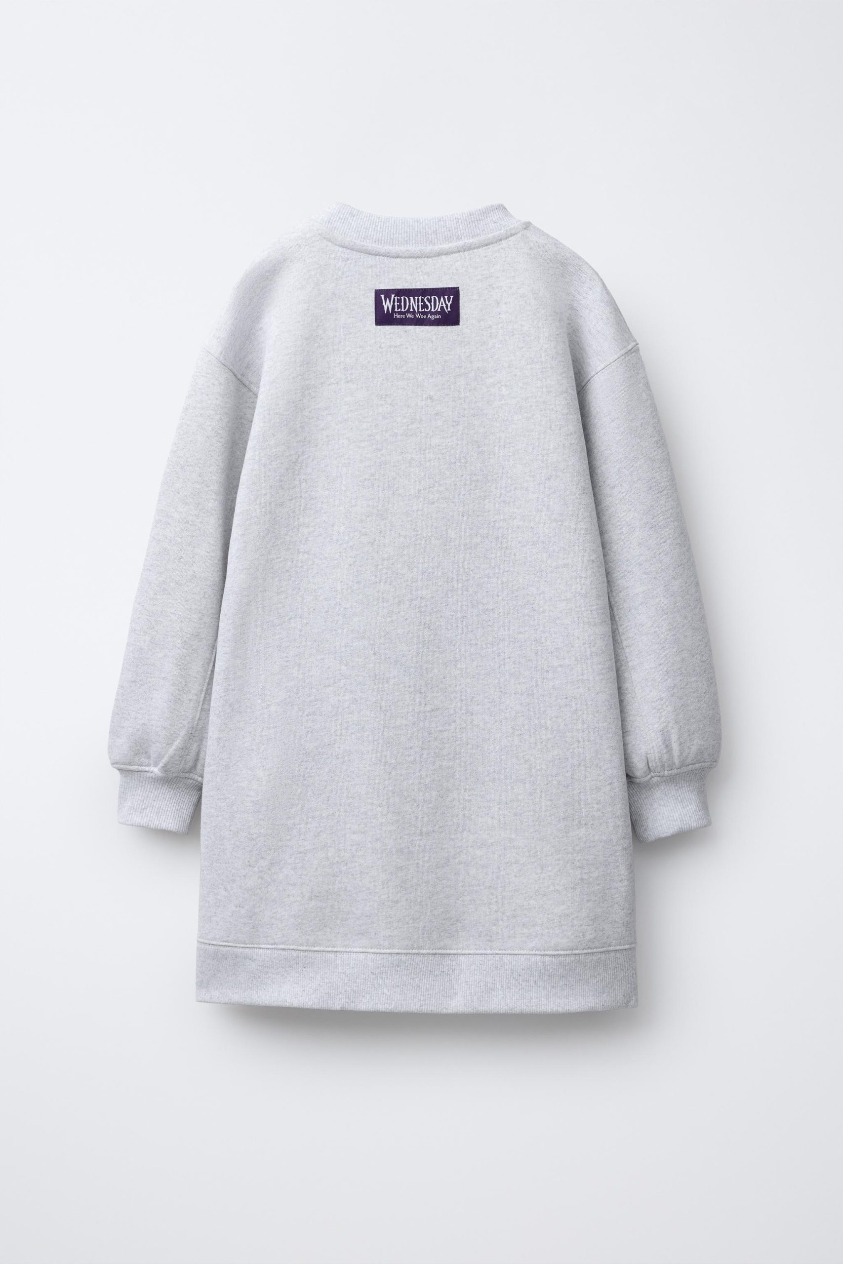 Wrap your little one in comfort with our WEDNESDAY Fleece Dress. This delightful dress features a round neck and long sleeves, perfect for cooler days. With ribbed trims and stylish vents at the hem, it boasts a charming WEDNESDAY print on the front and a playful label appliqué on the back. Made from a soft, brushed interior fabric that is 53% cotton, it ensures warmth and coziness for all-day wear. Ideal for both playtime and special occasions, this dress is a must-have for your child’s wardrobe!