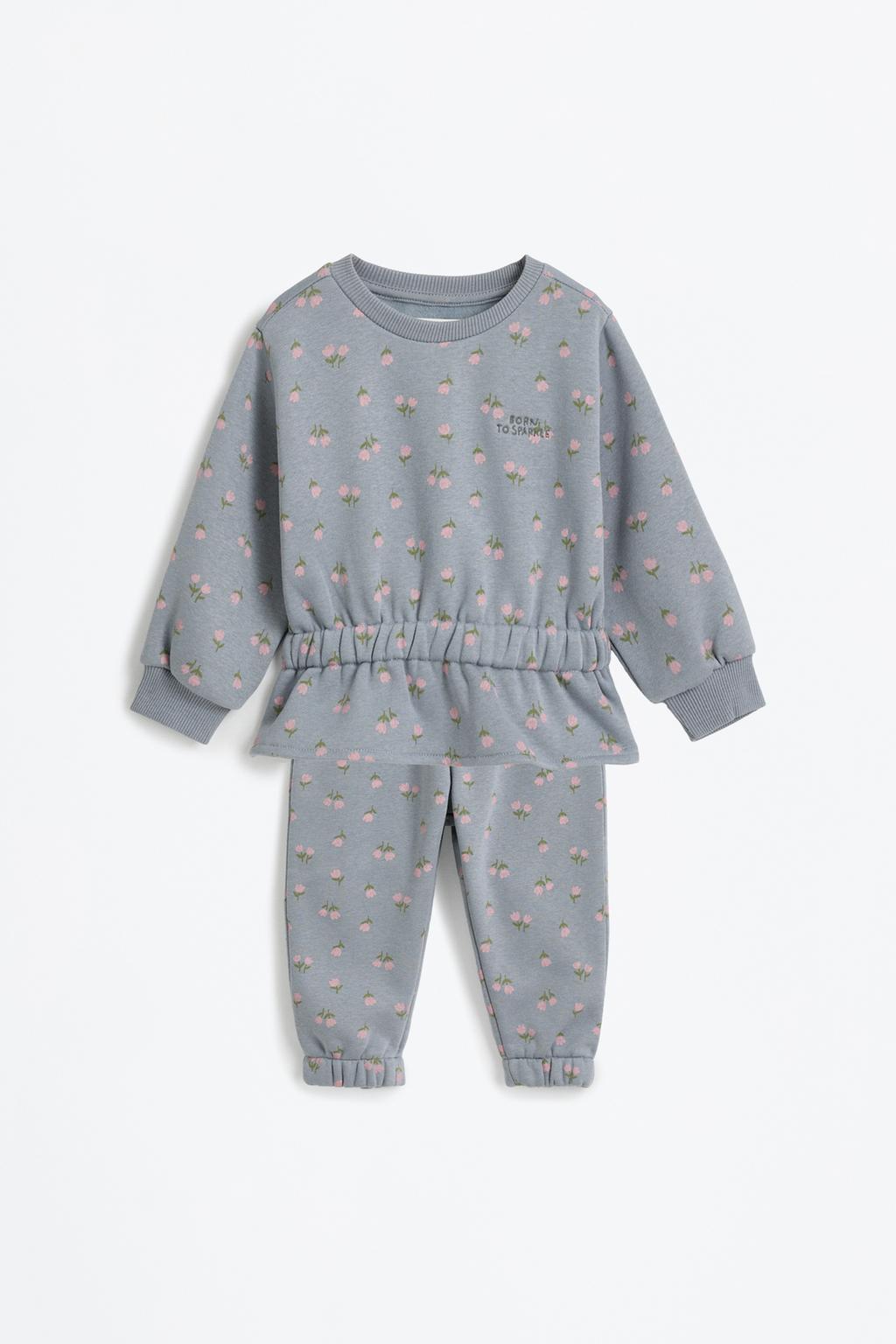 This adorable children’s outfit features a long-sleeve sweatshirt with a crew neck and ruffled cuffs, paired with matching pants that have an elastic waistband for a comfortable fit. Made from soft cotton fabric, this set is perfect for everyday wear, allowing little ones to play freely while looking stylish and coordinated.