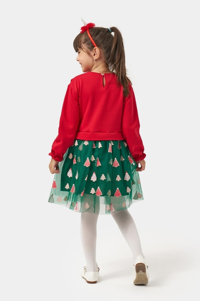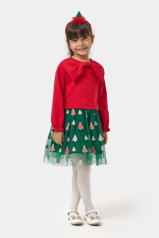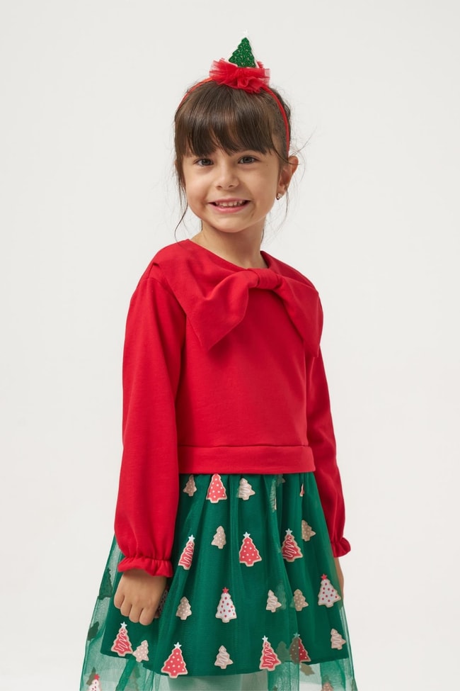 This beautifully designed cotton dress for girls captures the spirit of the new year with its vibrant colors and elegant details. Featuring a soft red cotton top accentuated by a large bow at the front, it brings a playful charm to any festive occasion. The skirt is adorned with colorful Christmas tree patterns on a green tulle overlay, while the comfortable cotton lining ensures warmth and coziness on chilly winter days. Perfect for holiday celebrations, this dress combines style and comfort for your little one.