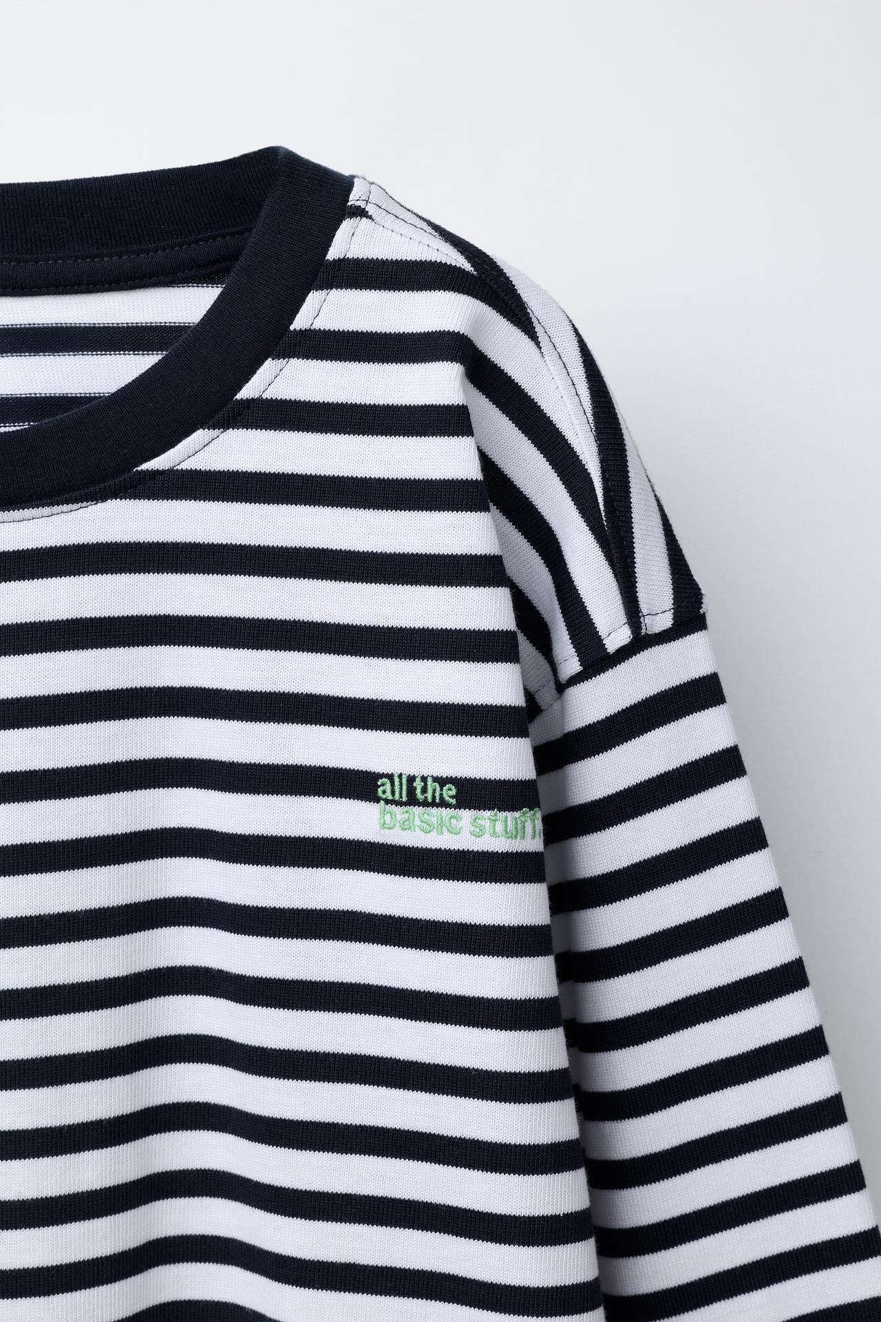 This stylish heavy weight striped t-shirt is perfect for your little ones, featuring a comfortable round neck and long sleeves with cozy cuffs. The eye-catching embroidered text detail on the chest adds a playful touch, making it a great choice for everyday wear. Crafted from 100% cotton, it ensures softness and breathability, allowing your child to move freely and comfortably throughout the day.