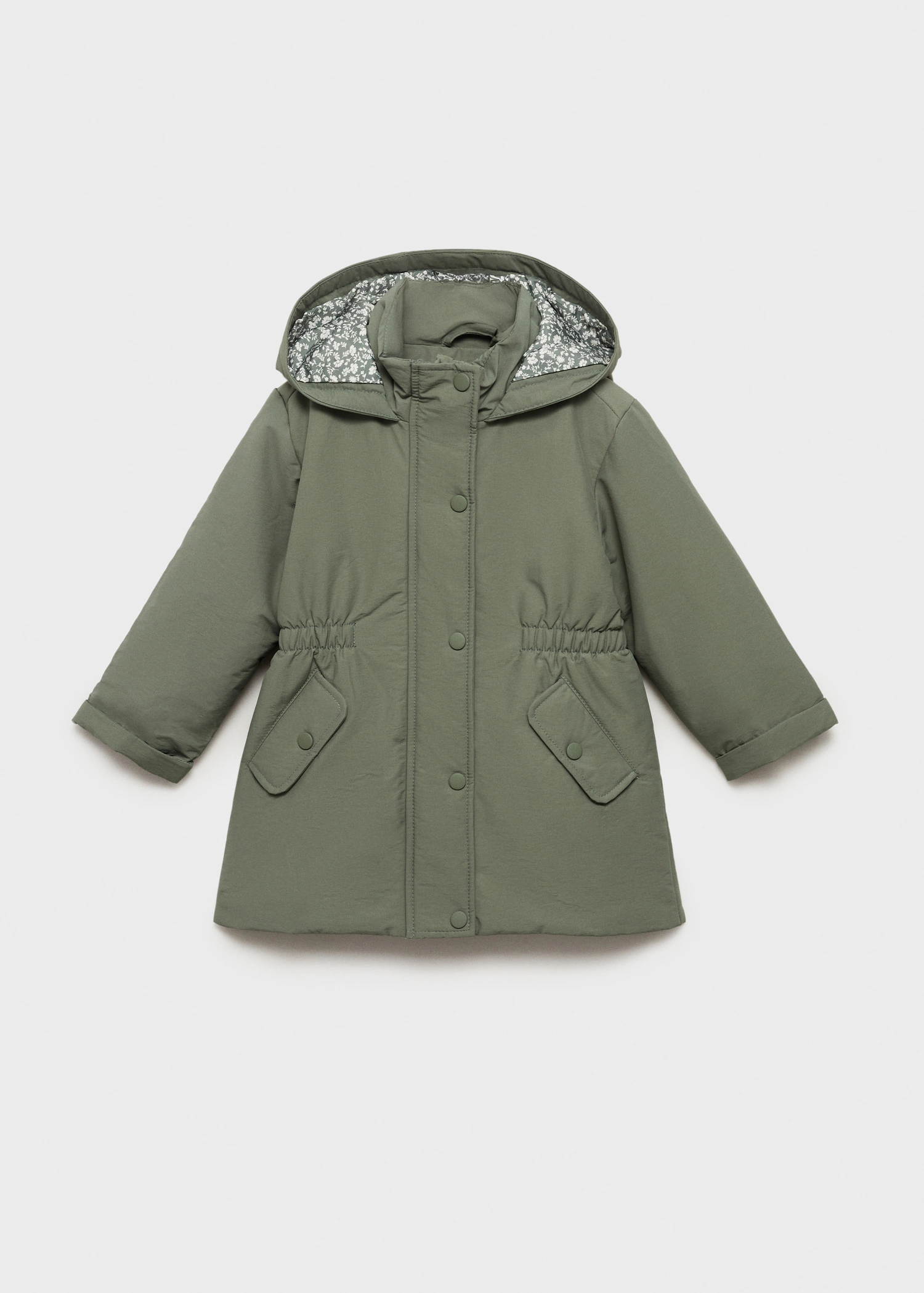 This stylish hooded trench coat is perfect for little adventurers! Made from quilted fabric, it features a trendy A-line design with long sleeves and a comfortable elasticized drawstring waist. The coat is equipped with both button and zipper closures for easy wear, and it has two handy flap pockets for storing treasures. The interior boasts a delightful floral pattern, adding a touch of whimsy to every outing. Keep your child warm and fashionable with this versatile outerwear piece!