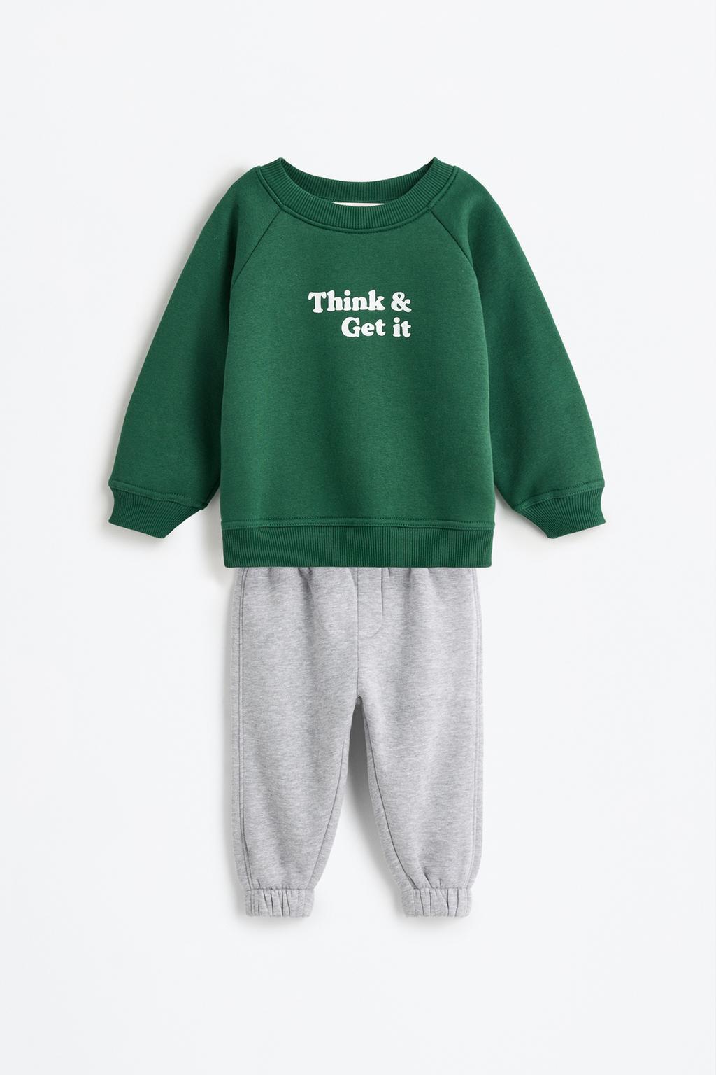 This delightful two-piece set includes a stylish sweatshirt and comfortable pants, perfect for little adventurers. The sweatshirt features a fun printed design on the front, with ribbed elastic trim on the neckline, sleeves, and hem for a snug fit. The pants have an elastic waistband and cuffed hems, ensuring a cozy and secure fit for active play. Made from soft, stretchy brushed cotton, this outfit is ideal for keeping your child both fashionable and comfortable throughout the day.
