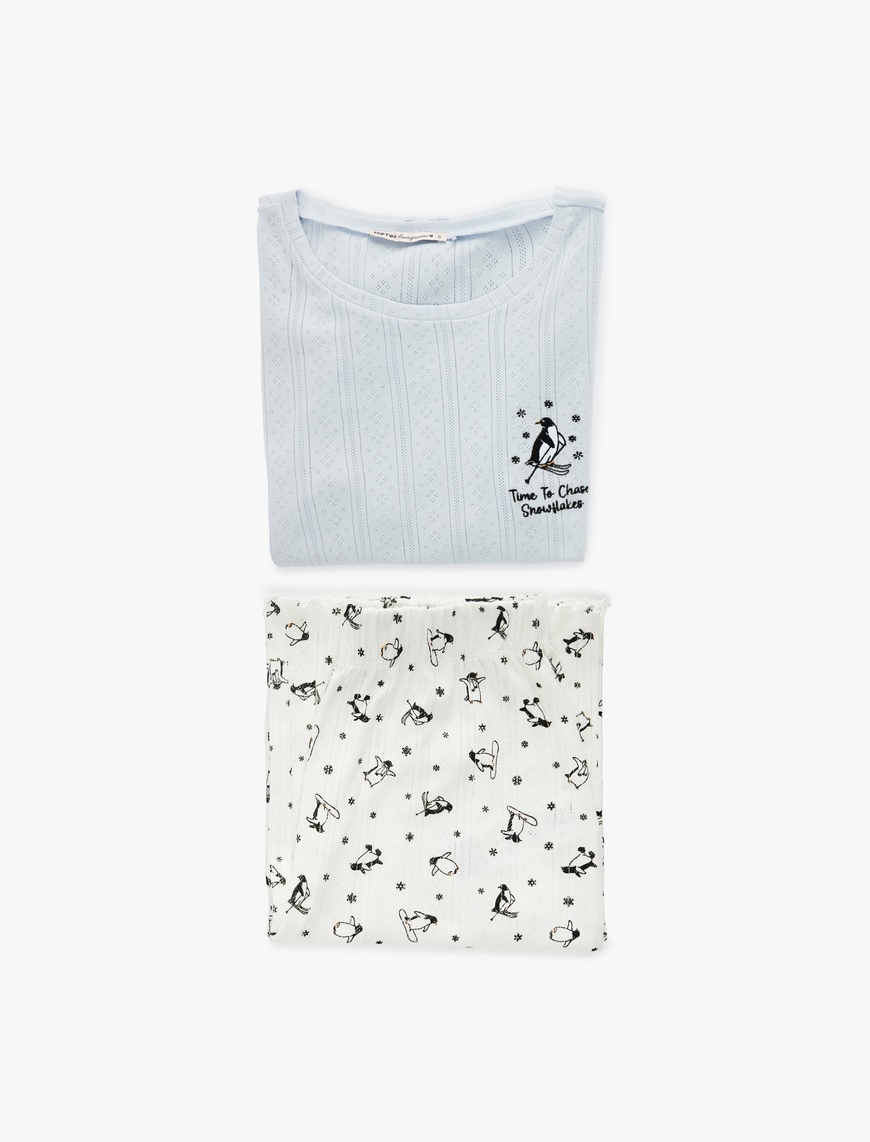 Snuggle up in our adorable printed pajama set featuring a cute penguin design. Made from soft, breathable cotton, this long sleeve crew neck set ensures your little one stays cozy and comfortable all night long. Perfect for bedtime stories or lazy mornings, these pajamas combine fun and functionality, making them a delightful addition to any child’s sleepwear collection.